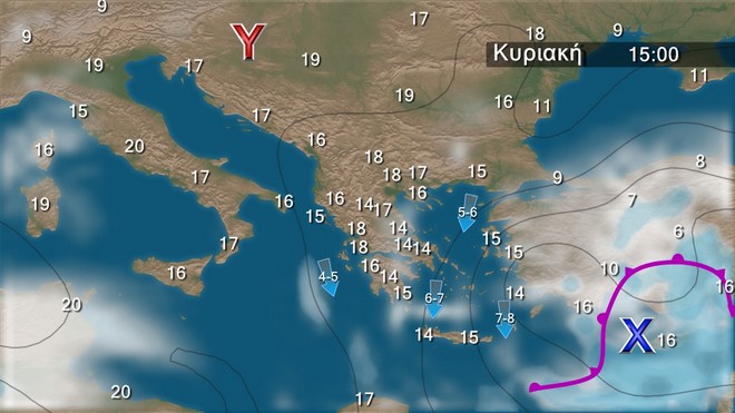 Την Κυριακή προβλέπονται λίγες νεφώσεις παροδικά αυξημένες στα ανατολικά και τα νότια με τοπικές βροχές στα ανατολικά ηπειρωτικά, τις Κυκλάδες, στα νησιά του ανατολικού Αιγαίου και την Κρήτη. Ασθενείς χιονοπτώσεις θα σημειωθούν στα ορεινά της Κρήτης. Οι άνεμοι θα πνέουν από βόρειες διευθύνσεις στα δυτικά 4 με 5, στα ανατολικά 6 με 7 και στο Αιγαίο τοπικά 8 μποφόρ με βαθμιαία εξασθένηση από το απόγευμα. Η θερμοκρασία θα παρουσιάσει μικρή άνοδο.