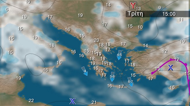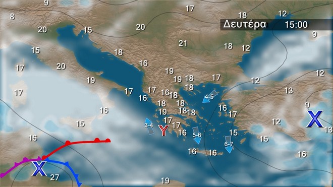 Τη Δευτέρα και την Τρίτη στις Κυκλάδες και την Κρήτη προβλέπονται νεφώσεις παροδικά αυξημένες με ασθενείς βροχές κυρίως τις πρωινές ώρες. Στην υπόλοιπη χώρα προβλέπεται γενικά αίθριος καιρός, τις μεσημβρινές και απογευματινές ώρες όμως στα ηπειρωτικά θα αναπτυχθούν τοπικές νεφώσεις και είναι πιθανόν στα κεντρικά και βόρεια ορεινά να εκδηλωθούν πρόσκαιροι όμβροι. Οι άνεμοι θα πνέουν στα δυτικά βόρειοι βορειοδυτικοί 3 με 4 μποφόρ, στα ανατολικά από βόρειες διευθύνσεις 4 με 6 και στο Αιγαίο τοπικά 7 μποφόρ. Η θερμοκρασία θα παρουσιάσει άνοδο.