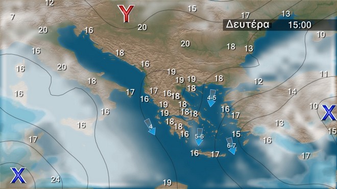 Τη Δευτέρα στις Κυκλάδες και την Κρήτη προβλέπονται νεφώσεις παροδικά αυξημένες με ασθενείς βροχές κυρίως τις πρωινές ώρες. Στην υπόλοιπη χώρα προβλέπεται γενικά αίθριος καιρός, τις μεσημβρινές και απογευματινές ώρες όμως στα ηπειρωτικά θα αναπτυχθούν τοπικές νεφώσεις και είναι πιθανόν στα κεντρικά και βόρεια ορεινά να εκδηλωθούν πρόσκαιροι όμβροι. Οι άνεμοι θα πνέουν στα δυτικά βόρειοι βορειοδυτικοί 3 με 4 μποφόρ. στα ανατολικά από βόρειες διευθύνσεις 4 με 6 και στο Αιγαίο τοπικά 7 μποφόρ. Η θερμοκρασία θα παρουσιάσει άνοδο.