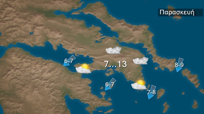 Οι άνεμοι θα πνέουν βόρειοι βορειοανατολικοί 6 με 8 και στα ανατολικά και νότια τοπικά 9 μποφόρ. Η θερμοκρασία σε χαμηλά για την εποχή επίπεδα. Παγετός θα σημειωθεί κατά τόπους τις πρωινές και τις βραδινές ώρες στα βόρεια ηπειρωτικά.