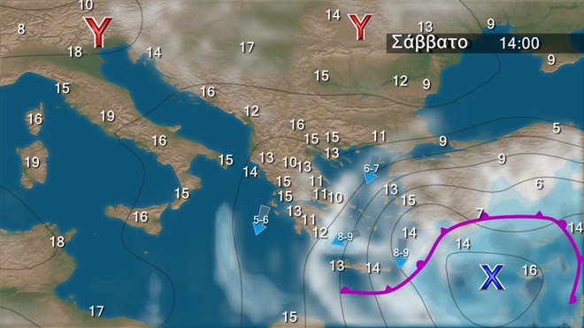 Το Σάββατο στην Κρήτη προβλέπονται νεφώσεις με βροχές και στα ορεινά χιονοπτώσεις. Στη δυτική και τη βόρεια Ελλάδα λίγες νεφώσεις παροδικά αυξημένες. Στην υπόλοιπη χώρα θα υπάρχουν νεφώσεις με τοπικές βροχές στα ανατολικά ηπειρωτικά, την Εύβοια, τις Κυκλάδες και τα Δωδεκάνησα. Παροδικές χιονοπτώσεις θα σημειωθούν στα ορεινά της ανατολικής ηπειρωτικής χώρας και της Εύβοιας μέχρι το μεσημέρι. Οι άνεμοι θα πνέουν βόρειοι 5 με 7, στα ανατολικά 8 και στο Αιγαίο τοπικά 9 μποφόρ με μικρή εξασθένηση από αργά το απόγευμα. Η θερμοκρασία θα παρουσιάσει μικρή άνοδο στα δυτικά, ενώ στα ανατολικά θα διατηρηθεί σε χαμηλά για την εποχή επίπεδα.