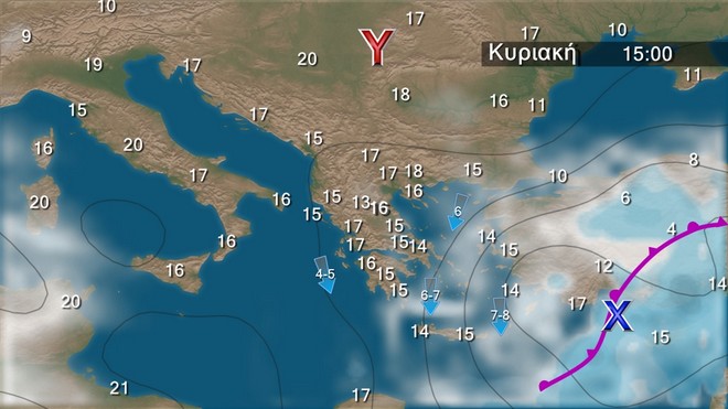 Την Κυριακή προβλέπονται λίγες νεφώσεις παροδικά αυξημένες στα ανατολικά και τα νότια με τοπικές βροχές στα ανατολικά ηπειρωτικά, τις Κυκλάδες, στα νησιά του ανατολικού Αιγαίου και την Κρήτη. Ασθενείς χιονοπτώσεις θα σημειωθούν στα ορεινά της Κρήτης. Οι άνεμοι θα πνέουν από βόρειες διευθύνσεις στα δυτικά 4 με 5, στα ανατολικά 6 με 7 και στο Αιγαίο τοπικά 8 μποφόρ με βαθμιαία εξασθένηση από το απόγευμα. Η θερμοκρασία θα παρουσιάσει μικρή άνοδο.