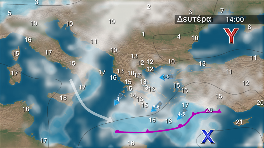 Τη Δευτέρα ο καιρός θα είναι βελτιωμένος στα βόρεια και στα υπόλοιπα θα υπάρχει τοπική συννεφιά με λίγες βροχές στα νότια . Οι άνεμοι θα πνέουν μέχρι μέτριοι και η θερμοκρασία θα ανέβει κι άλλο φτάνοντας περί τους 13 με 15 βαθμούς Κελσίου.