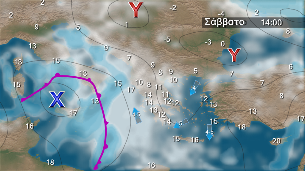 O συνδυασμός των υψηλών πιέσεων της Βόρειας Βαλκανικής με τις χαμηλές πιέσεις της Ανατολικής Μεσογείου θα εξασθενήσει γρήγορα και οι άνεμοι στα πελάγη δεν θα ξεπερνούν τα 5 με 6 μποφόρ.