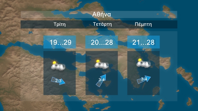Στην Αθήνα προβλέπεται αίθριος καιρός και μόνο το μεσημέρι και το απόγευμα θα αναπτυχθούν τοπικές νεφώσεις στα βόρεια. Οι άνεμοι θα πνέουν από δυτικές διευθύνσεις 3 με 4 και πρόσκαιρα 4 με 5 μπ και η θερμοκρασία θα φτάσε τους 29 βαθμούς.