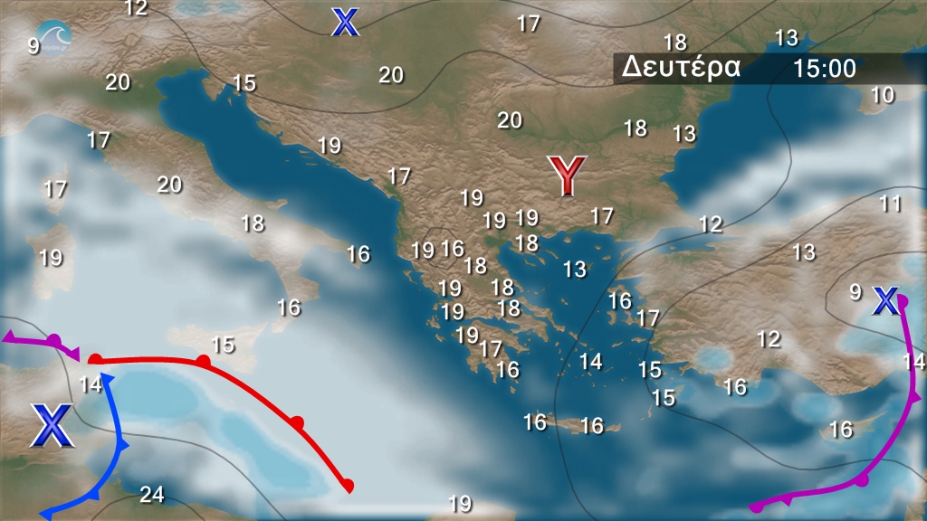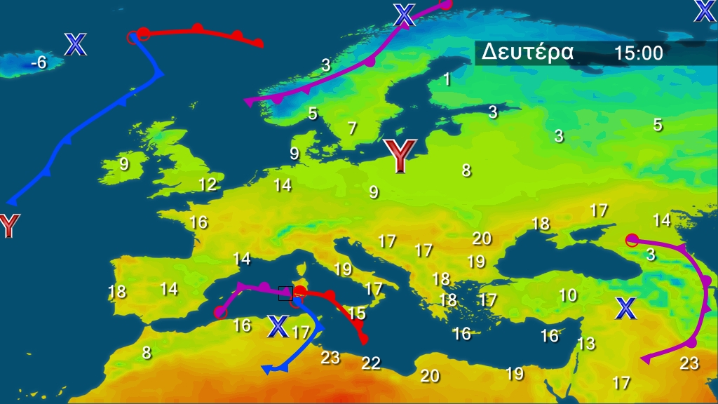 Στον χάρτη της Βαλκανικής που ακολουθεί παρατηρούμε ότι το χαμηλό έχει περάσει στα νοτιοανατολικά και στην περιοχή μας έχει επικρατήσει πεδίο υψηλών πιέσεων . Έτσι την Δευτέρα σε όλη τη χώρα προβλέπεται σχεδόν αίθριος καιρός με μικρή πιθανότητα για λίγες τοπικές βροχές μόνο στην Κρήτη. Οι άνεμοι θα πνέουν από βόρειες διευθύνσεις στα δυτικά 3 με 4 μπ στα ανατολικά 5 με 6 και τοπικά στα νότια 7 με 8 μπ με βαθμιαία εξασθένηση. Η θερμοκρασία θα φτάσει τους 21 βαθμούς στα δυτικά και τα βόρεια , στα ανατολικά ηπειρωτικά τους 20 και στα νησιά του Αιγαίου τους 17 με 18 βαθμούς Κελσίου.