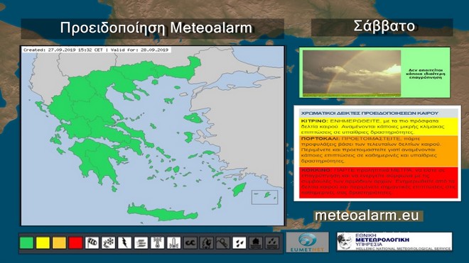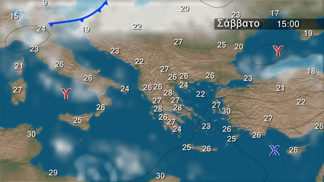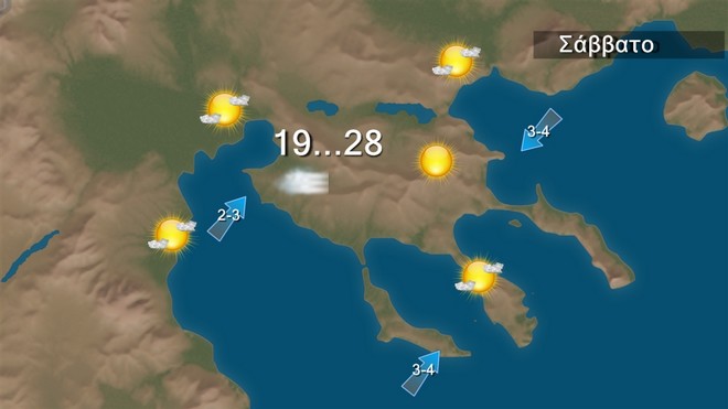 Το Σάββατο προβλέπεται γενικά αίθριος καιρός και μόνο στα ηπειρωτικά ορεινά και την Πελοπόννησο θα αναπτυχθούν πρόσκαιρες νεφώσεις το μεσημέρι και το απόγευμα και θα εκδηλωθούν τοπικές βροχές ή όμβροι. Η ορατότητα θα είναι κατά τόπους περιορισμένη στα δυτικά και τα βόρεια τις πρωινές και τις βραδινές ώρες. Οι άνεμοι θα πνέουν στα δυτικά μεταβλητοί 3 με 4 μποφόρ, στα ανατολικά από βόρειες διευθύνσεις 3 με 5 και στο Αιγαίο τοπικά 6 μποφόρ. Η θερμοκρασία δεν θα σημειώσει αξιόλογη μεταβολή και θα φτάσει στα δυτικά τους 31 βαθμούς, στα βόρεια τους 30 στα υπόλοιπα ηπειρωτικά επίσης τους 30 και στο Αιγαίο τους 29 βαθμούς Κελσίου.