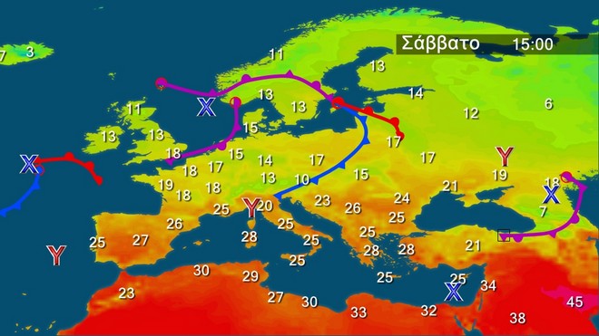 Στον γενικό χάρτη της Ευρώπης διακρίνεται ένα ισχυρό βαρομετρικό χαμηλό στη Δυτική Ευρώπη . Στην περιοχή μας έχουμε σχετικά ομαλό βαρομετρικό πεδίο.
