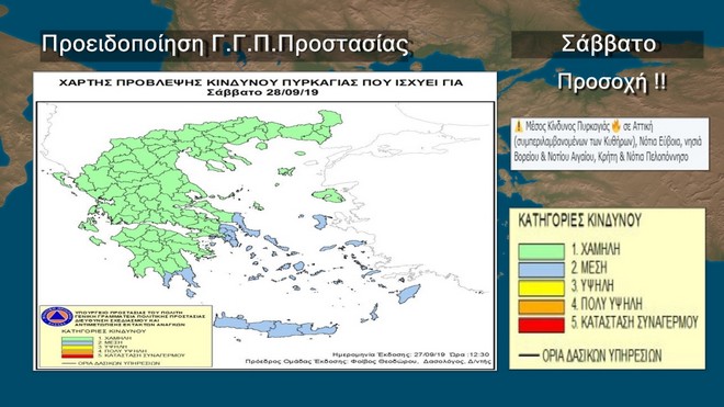 Από πλευράς επικινδυνότητας πυρκαγιών θα έχουμε Μέσο κίνδυνο Πυρκαγιάς σε Αττική (συμπεριλαμβανομένων των Κυθήρων), Νότια Εύβοια, νησιά Βορείου & Νοτίου Αιγαίου, Κρήτη & Νότια Πελοπόννησο σύμφωνα με την πρόβλεψη της Γενικής Γραμματείας Πολιτικής Προστασίας.