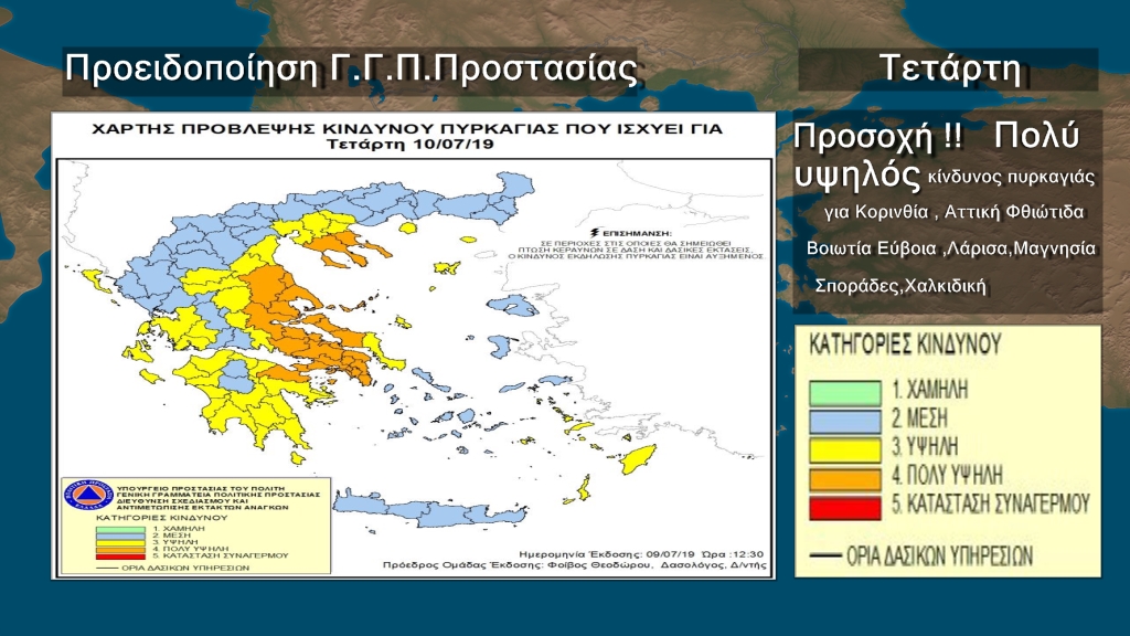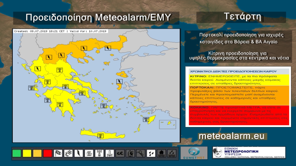 Την Τετάρτη  θα διατηρηθούν οι υψηλές θερμοκρασίες στα κεντρικά και τα νότια χώρα και υπάρχει προειδοποίηση με κίτρινο χρώμα για τις υψηλές θερμοκρασίες. Ισχυρές καταιγίδες θα εκδηλωθούν το βράδυ στα βόρεια και υπάρχει έκτακτο δελτίο με πορτοκαλί προειδοποίηση . Από πλευράς επικινδυνότητας πυρκαγιών θα έχουμε πολύ υψηλή κατηγορία για Κορινθία, Αττική, Φθιώτιδα, Βοιωτία, Εύβοια, Λάρισα, Μαγνησία, Σποράδες, Χαλκιδική σύμφωνα με την πρόβλεψη της Γενικής Γραμματείας Πολιτικής Προστασίας.