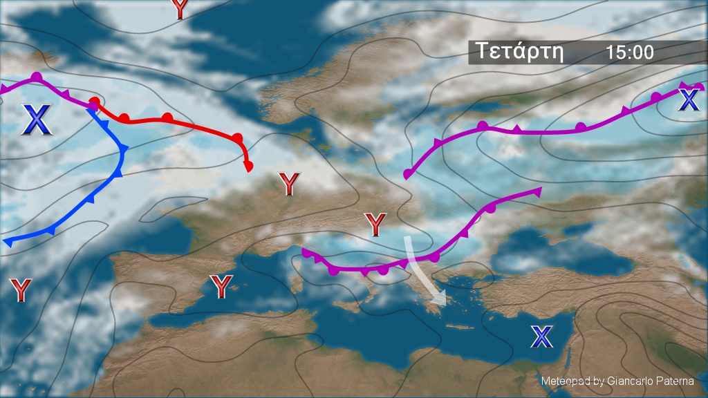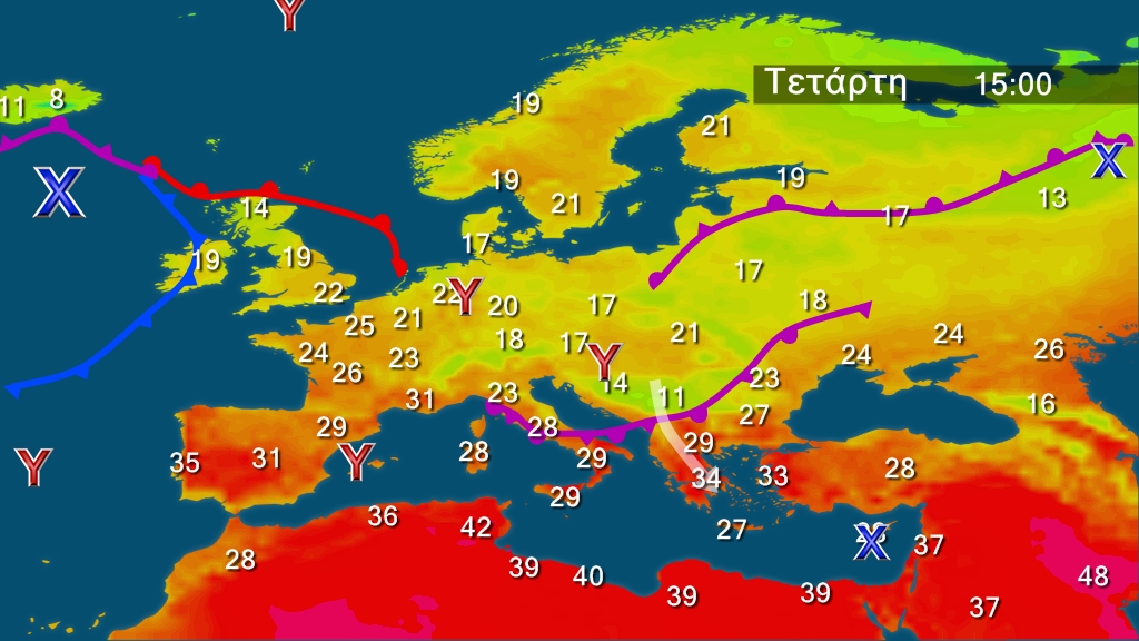 Στον γενικό χάρτη της Ευρώπης διακρίνονται τα χαμηλά που επηρεάζουν τη Βόρεια Ευρώπη στα βορειοδυτικά και τα βορειοανατολικά τμήματα. Το ψυχρό μέτωπο στα βόρεια Βαλκάνια θα κινηθεί νοτιότερα και θα προκαλέσει πτώση της θερμοκρασίας κατά 8 με 10 βαθμούς την Πέμπτη και ισχυρές καταιγίδες στα βόρεια.