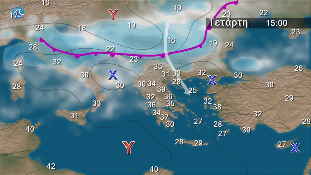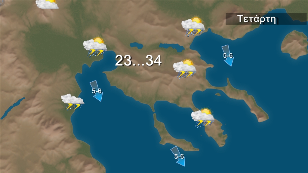 Την Τετάρτη αρχικά στην ανατολική Μακεδονία και τη Θράκη και βαθμιαία και στην υπόλοιπη Μακεδονία και την Ήπειρο προβλέπονται νεφώσεις παροδικά αυξημένες με τοπικές βροχές και σποραδικές καταιγίδες κατά τόπους ισχυρές. Το βράδυ τα φαινόμενα θα περιοριστούν στην κεντρική, την ανατολική  Μακεδονία, τη Θράκη και τα νησιά του βόρειου Αιγαίου. Στην υπόλοιπη χώρα γενικά αίθριος καιρός με τοπικές νεφώσεις τις μεσημβρινές και απογευματινές ώρες στα ηπειρωτικά όπου θα εκδηλωθούν πρόσκαιροι όμβροι ή καταιγίδες κυρίως στα ορεινά της Θεσσαλίας και της Στερεάς. Οι άνεμοι θα πνέουν από δυτικές διευθύνσεις 3 με 5 και στο νοτιοανατολικό Αιγαίο τοπικά 6 μποφόρ. Από το βράδυ και από τα βόρεια θα στραφούν σε βόρειους 5 με 7 μποφόρ. Η θερμοκρασία σε μικρή πτώση στα βόρεια  θα φτάσει τους 36 βαθμούς ωστόσο στις υπόλοιπες περιοχές θα παραμείνει σε υψηλά επίπεδα στους 39 με 40 και στα νησιά 36 βαθμούς .