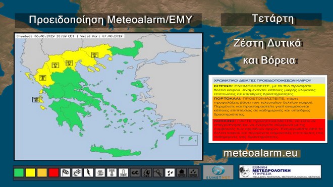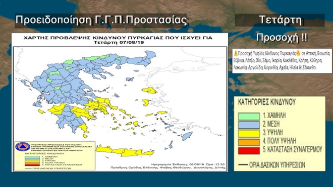 Από πλευράς επικινδυνότητας πυρκαγιών την Τετάρτη θα έχουμε Υψηλό Κίνδυνο Πυρκαγιάς σε Αττική, Βοιωτία, Εύβοια, Λέσβο, Χίο, Σάμο, Ικαρία, Κυκλάδες, Κρήτη, Κύθηρα, Λακωνία, Αργολίδα, Κορινθία, Αχαΐα, Ηλεία & Ζάκυνθο. σύμφωνα με την πρόβλεψη της Γενικής Γραμματείας Πολιτικής Προστασίας.