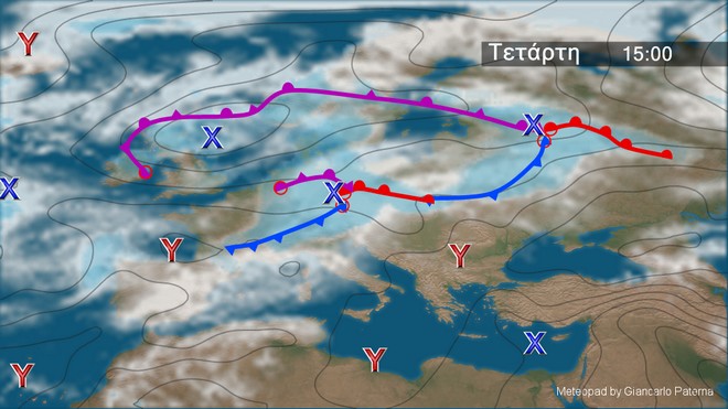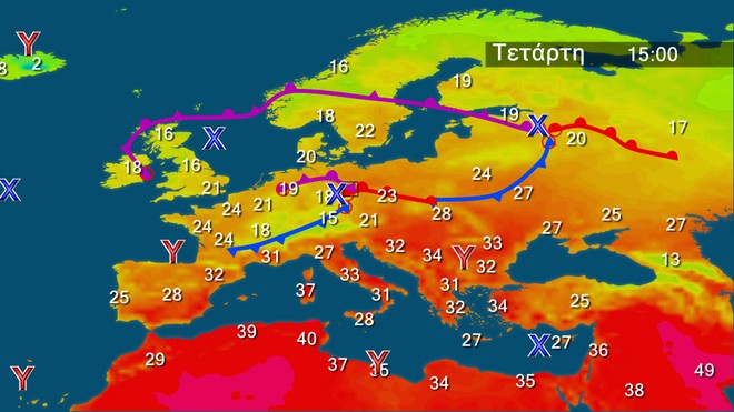Στον γενικό χάρτη της Ευρώπης διακρίνονται τα ισχυρά βαρομετρικά χαμηλά στα δυτικά τμήματα ενώ στη Βαλκανική υπάρχει συνδυασμός των υψηλών πιέσεων με τις χαμηλές στη περιοχή της Κύπρου που προκαλούν το το μελτέμι στο Αιγαίο.