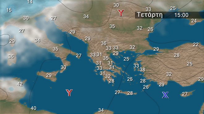 Την Τετάρτη προβλέπεται γενικά αίθριος καιρός. Πρόσκαιρες νεφώσεις θα αναπτυχθούν τις απογευματινές ώρες στα βορειοδυτικά ηπειρωτικά ορεινά. Οι άνεμοι θα πνέουν, στα δυτικά μεταβλητοί 3 με 4 και το απόγευμα δυτικοί βορειοδυτικοί 4 με 5 μποφόρ, στα ανατολικά από βόρειες διευθύνσεις 4 με 6 και στο Αιγαίο τοπικά κατά τη διάρκεια της ημέρας έως 7 μποφόρ. Η θερμοκρασία θα σημειώσει μικρή άνοδο. φτάνοντας στα βόρεια και τα δυτικά τους 35 με 36 βαθμούς , στα υπόλοιπα ηπειρωτικά τους 36 και στο Αιγαίο τους 31 με 35 βαθμούς Κελσίου.