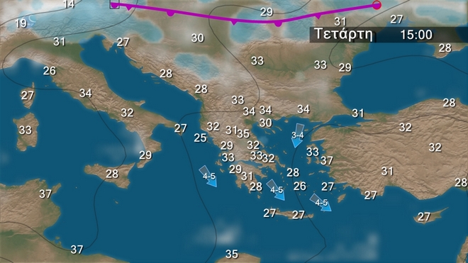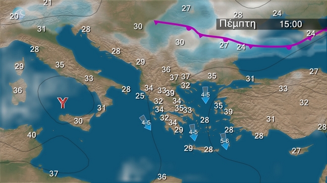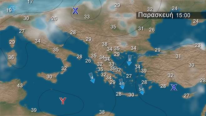 Στα βόρεια αρχικά αίθριος καιρός βαθμιαία όμως θα αναπτυχθούν νεφώσεις και θα εκδηλωθούν τοπικοί όμβροι κυρίως στην ανατολική Μακεδονία και τη Θράκη. Στις υπόλοιπες περιοχές γενικά αίθριος. Οι άνεμοι στα βόρεια θα είναι αρχικά μεταβλητοί ασθενείς και το απόγευμα βορείων διευθύνσεων 4 με 5 μποφόρ. Στα υπόλοιπα θα πνέουν δυτικοί βορειοδυτικοί 3 με 5 και τοπικά στα πελάγη 6 μποφόρ. Η θερμοκρασία θα σημειώσει περαιτέρω άνοδο και οι τιμές της θα κυμανθούν σε υψηλά επίπεδα στα ανατολικά και τα νότια ηπειρωτικά και θα φτάσουν περί τους 39 με 40 βαθμούς.