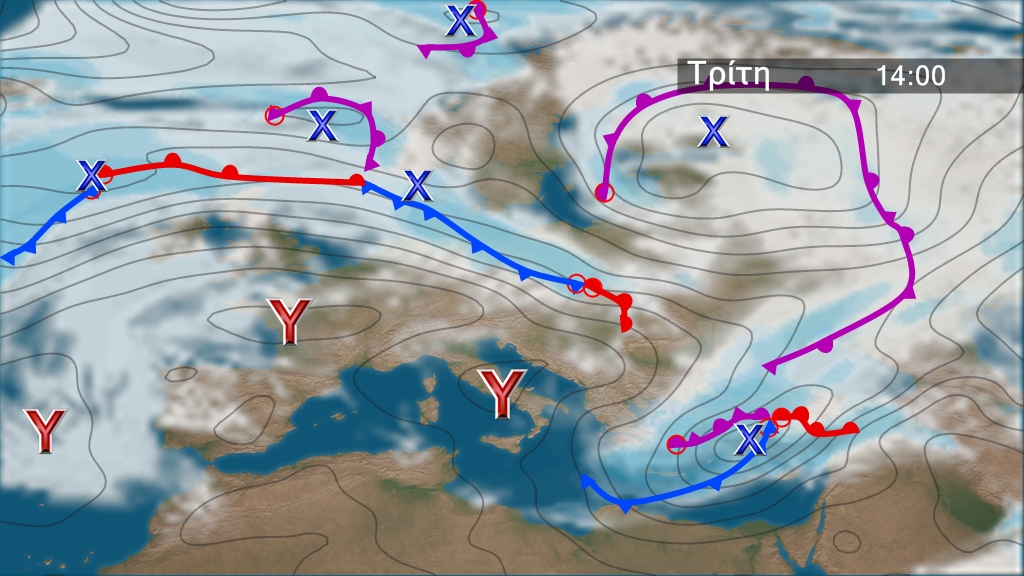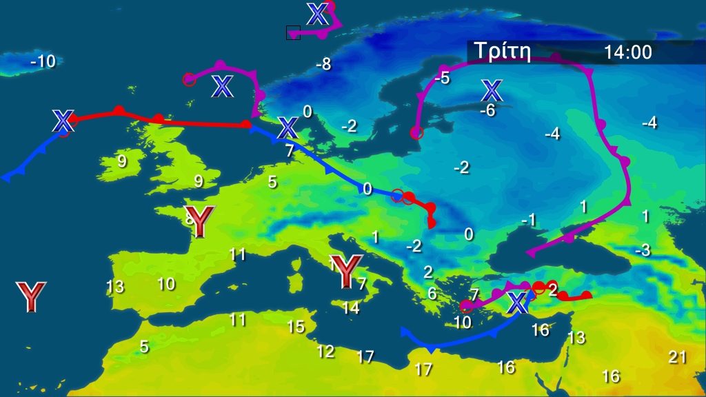 Στον χάρτη των βαρομετρικών συστημάτων της Ευρώπης παρατηρούμε το χαμηλό που μας επηρεάζει κινείται ανατολικά και στην περιοχή μας επεκτείνεται ο αντικυκλώνας που υπάρχει στην Ιταλία.