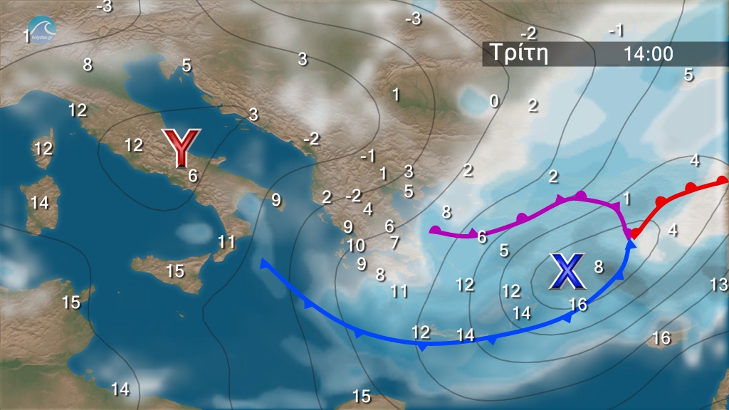 Οι ψυχρές αέριες μάζες που ήρθαν στην ανώτερη ατμόσφαιρα δημιούργησαν βαθύ βαρομετρικό χαμηλό στην περιοχή μας το οποίο θα προκαλέσει χιονοπτώσεις, βροχές και πολύ θυελλώδεις ανέμους στα πελάγη, όπως περιγράφονται στο έκτακτο δελτίο επιδείνωσης του καιρού (ΕΔΕΚ).