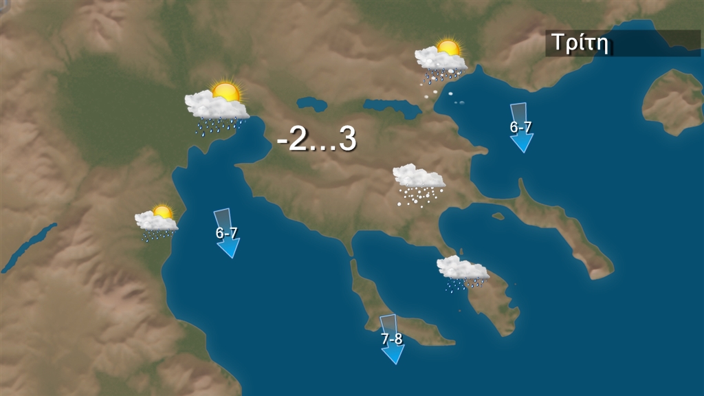 Σήμερα προβλέπονται νεφώσεις με τοπικές βροχές και σποραδικές καταιγίδες κυρίως στα κεντρικά και νότια, κατά τόπους ισχυρές. Χιονοπτώσεις θα εκδηλωθούν στα ορεινά και ημιορεινά καθώς και σε περιοχές με χαμηλότερο υψόμετρο αρχικά στα κεντρικά και βόρεια και βαθμιαία και στα υπόλοιπα, οι οποίες θα είναι κατά τόπους πυκνές.