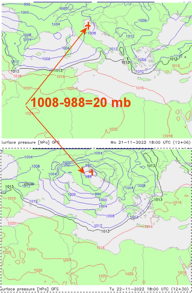 Στον παραπάνω χάρτη παρατηρούμε ότι ενώ τις απογευματινές ώρες της Δευτέρας 21 Νοεμβρίου 2022 οι πιέσεις στην περιοχή της Αδριατικής ήταν στα 1008 hPa μέσα σε ένα 24ωρο την Τρίτη 18:00 UTC τα προγνωστικά δείχνουν να πέφτουν στα 988 hPa δηλαδή παρουσιάζουν πτώση της τάξεως των 20 hPa σε ένα 24ωρο.