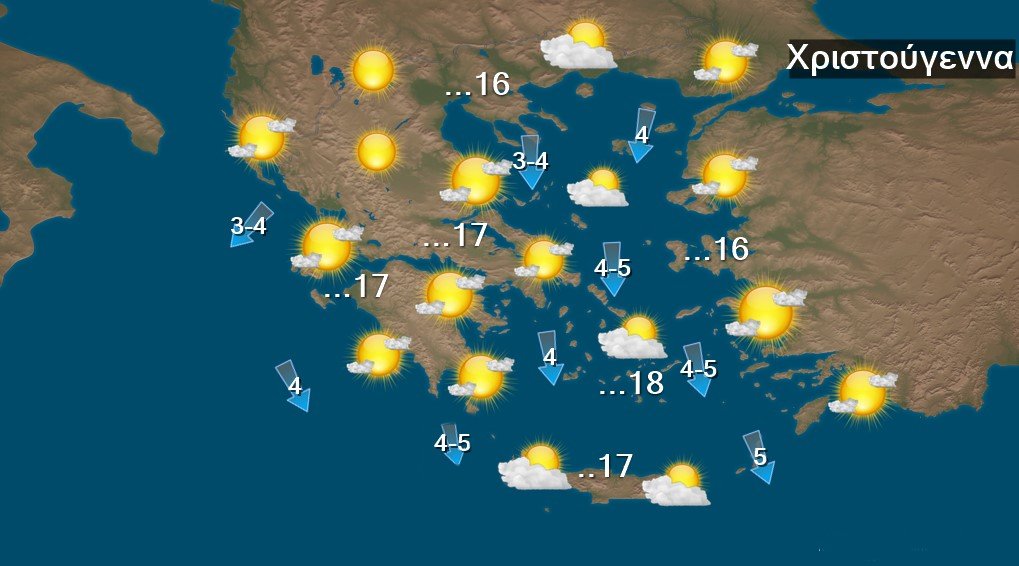 Σύμφωνα με την πρόγνωση της ΕΜΥ τα Χριστούγεννα θα επικρατήσει γενικά αίθριος καιρός με λίγες πρόσκαιρες νεφώσεις. Τις πρωινές και βραδινές ώρες η ορατότητα θα είναι τοπικά περιορισμένη στα ηπειρωτικά.