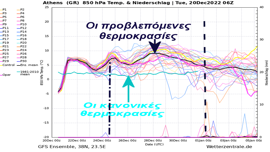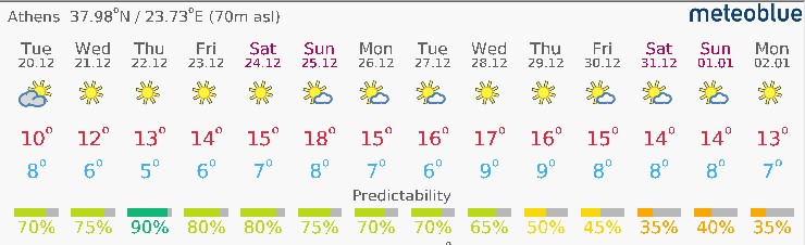 Προς το παρόν θα χρησιμοποιήσουμε το κλασικό μετεώγραμμα, της Αθήνας όπου παρατηρούμε ότι τα Χριστούγεννα θα έχουμε σχεδόν αίθριο καιρό και ο καιρός αυτός θα διατηρηθεί μέχρι την Πρωτοχρονιά. Οι θερμοκρασίες θα βρίσκονται σε επίπεδα πάνω από τα κανονικά κατά 2 με 5 βαθμούς Κελσίου και δεν προβλέπονται βροχές.