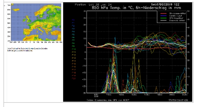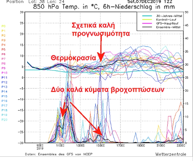 Στο παραπάνω παράδειγμα με μια γρήγορη ματιά μπορούμε να διακρίνουμε τα δύο κύρια κύματα βροχοπτώσεων που έρχονται στις 11 και στις 15 του μηνός Δεκεμβρίου, ενώ στο πάνω μέρος βλέπουμε ότι η θερμοκρασία δεν φαίνεται να αλλάζει σημαντικά. Στο μετεώγραμμα γίνεται αναφορά ότι έχω καλή προγνωσιμότητα της ατμόσφαιρας μέχρι τις 15 του μηνός. Όπως μπορείτε να παρατηρήσετε, από εκεί και μετά οι αποκλίσεις των τιμών γίνονται μεγάλες και απέχουν πολύ από τον μέσο όρο (την μαύρη καμπύλη). Θεωρώ λοιπόν το μοντέλο αξιόπιστο μέχρι αυτήν την ημερομηνία και δεν ψάχνω για τις επόμενες ημέρες.