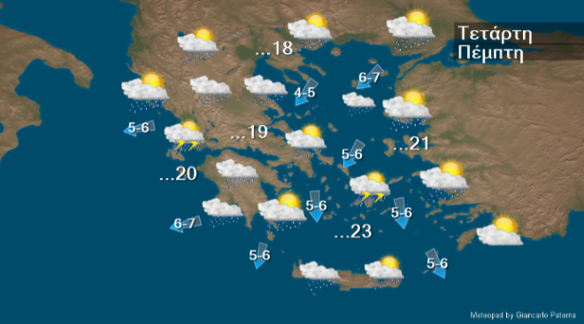 Σποραδικές καταιγίδες θα εκδηλωθούν στη νότια νησιωτική χώρα και οι άνεμοι θα πνέουν στα δυτικά ανατολικοί νοτιοανατολικοί 5 με 6 και στο Ιόνιο τοπικά 7 μποφόρ. Στα ανατολικά οι άνεμοι θα είναι βορειοανατολικοί 4 με 6 και στο βόρειο Αιγαίο έως 7 μποφόρ.