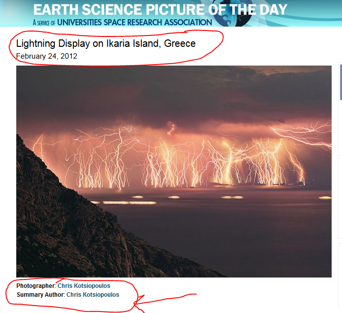 Εάν επισκεφτείτε την συγκεκριμένη ιστοσελίδα θα παρατηρήσετε και σεις ότι ο κύριος Κοτσιόπουλος πήρε αυτή την ακολουθία φωτογραφιών με 70 φωτογραφίες η οποία παρουσιάζει τις αστραπές που εμφανίστηκαν κατά τη διάρκεια μιας έντονης καταιγίδας το καλοκαίρι του 2011 στο νησί της Ικαρίας, κοντά στην νοτιοδυτική ακτή της Τουρκίας. Αυτή η καιρική δραστηριότητα έλαβε χώρα κατά τη διάρκεια της φωτογραφικής του καταγραφής στην διάρκεια της ολικής έκλειψης σελήνης στις 15 Ιουνίου 2011.