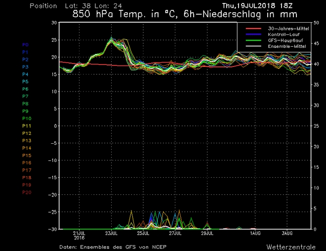 Στο παραπάνω διάγραμμα την Κυριακή η θερμοκρασία στα 850 είναι 22 βαθμοί περίπου αλλά τη Δευτέρα βρίσκεται στους 24 βαθμούς και αυτό μας οδηγεί στην εκτίμηση για 37 βαθμούς την Κυριακή (22+15=37) και 39 τη Δευτέρα ( 24+15=39) με τον τρόπο που έχουμε αναφέρει σε προηγούμενα άρθρα .