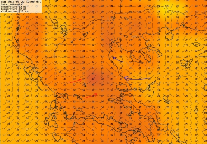 Σύμφωνα με τα δεδομένα του προγνωστικού μοντέλου που χρησιμοποιεί η ΕΜΥ παρατηρούμε ότι στη Βόρεια Ελλάδα δεν προβλέπονται τιμές πάνω από 34 με 36 βαθμούς, στα υπόλοιπα ηπειρωτικά θα είμαστε περί τους 35 με 37 βαθμούς και μόνο σε τοπικό επίπεδο η θερμοκρασία θα φτάσει οριακά και τους 39 με 40 βαθμούς και αυτό αποτυπώνεται στον παρακάτω χάρτη.