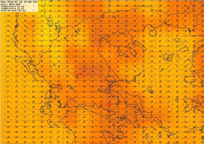 Οι μέγιστες θερμοκρασίες πάνω από τους 40 βαθμούς θα εμφανιστούν στη Δυτική Θεσσαλία και μερικώς στη Στερεά , εκεί που οι Δ-ΝΔ άνεμοι θα έχουν χαρακτηριστικά λίβα , ως καταβατικοί άνεμοι. Αντίθετα στα ανατολικά τμήματα αυτών των περιοχών που θα επικρατήσουν Ανατολικοί Νοτιοανατολικοί άνεμοι με χαρακτηριστικά θαλάσσιας αύρας θα δίνουν ανάσα δροσιάς με χαμηλότερες τιμές θερμοκρασίας .