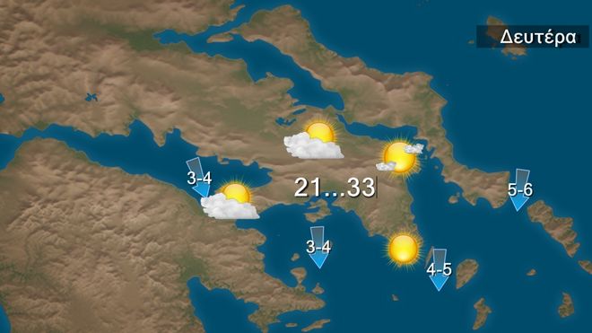 Τη Δευτέρα στο Ιόνιο, τα ηπειρωτικά και τις Σποράδες, προβλέπεται άστατος καιρός κατά περιόδους νεφελώδης με τοπικές βροχές και σποραδικές καταιγίδες. Τα φαινόμενα θα είναι κατά τόπους έντονα, τις πρωινές και βραδινές ώρες στη Θεσσαλία, τη δυτική και κεντρική Μακεδονία και πιθανώς στις Σποράδες, τις μεσημβρινές και απογευματινές ώρες στην Ήπειρο, τη Στερεά και κυρίως στην Πελοπόννησο. Στην υπόλοιπη χώρα θα επικρατήσει γενικά αίθριος καιρός. Οι άνεμοι θα πνέουν από βόρειες και βαθμιαία στα νότια από δυτικές διευθύνσεις τοπικά στο Αιγαίο μέχρι 6 μποφόρ. Η θερμοκρασία δεν θα σημειώσει αξιόλογη μεταβολή και θα έχει μέγιστη τιμή στα βόρεια τους 31 βαθμούς στα υπόλοιπα ηπειρωτικά και το Ιόνιο τους 33 με 34 και στα νησιά του Αιγαίου τους 31 με 33 βαθμούς Κελσίου.