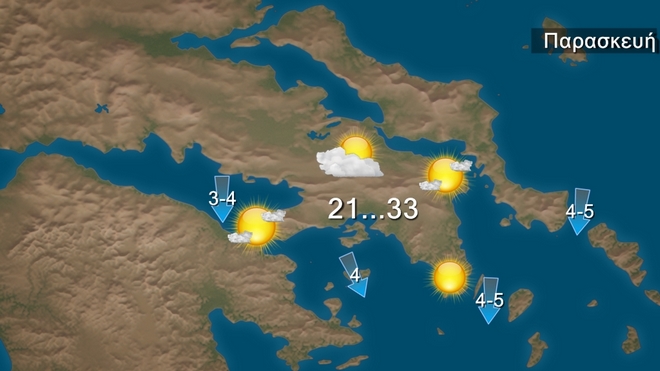 Στην Αττική προβλέπεται γενικά αίθριος καιρός. Οι άνεμοι θα πνέουν μεταβλητοί 3-4 μποφόρ και τοπικά βόρειοι στα ανατολικά το πολύ 4 με 5 μποφόρ. Η θερμοκρασία θα κυμανθεί από 21 έως 33 βαθμούς Κελσίου..