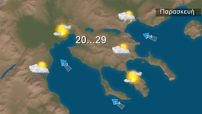Την Παρασκευή τοπικοί όμβροι και μεμονωμένες καταιγίδες θα εκδηλωθούν στα ηπειρωτικά τις μεσημβρινές και απογευματινές ώρες , ενώ στα νησιά θα επικρατήσει γενικά αίθριος καιρός. Οι άνεμοι θα πνέουν από βόρειες διευθύνσεις 4-5 και στο Αιγαίο τοπικά 6 μποφόρ. Η θερμοκρασία δεν θα σημειώσει αξιόλογη μεταβολή και θα έχει μέγιστη τιμή στα βόρεια τους 32 βαθμούς στα υπόλοιπα ηπειρωτικά και το Ιόνιο τους 33 με 34 και στα νησιά του Αιγαίου τους 29 με 31 βαθμούς Κελσίου