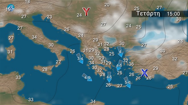 Στα ηπειρωτικά και την Κρήτη, άστατος καιρός κατά περιόδους νεφελώδης, με τοπικές βροχές και σποραδικές καταιγίδες. Τα φαινόμενα, τις μεσημβρινές και απογευματινές ώρες κυρίως στην Πελοπόννησο και την Κρήτη, και πιθανώς πρόσκαιρα τις πρώτες πρωινές ώρες στη Θεσσαλία και την κεντρική Μακεδονία, θα είναι κατά τόπους έντονα. Στην υπόλοιπη χώρα γενικά αίθριος καιρός, με παροδικές νεφώσεις στο Ιόνιο, τις Κυκλάδες και το βόρειο Αιγαίο, όπου θα εκδηλωθούν τοπικοί όμβροι ή μεμονωμένες καταιγίδες. Οι άνεμοι θα πνέουν δυτικοί βορειοδυτικοί 3 με 5 μποφόρ και στα βορειοανατολικά βορειοανατολικοί με την ίδια ένταση. Η θερμοκρασία δεν θα σημειώσει αξιόλογη μεταβολή.