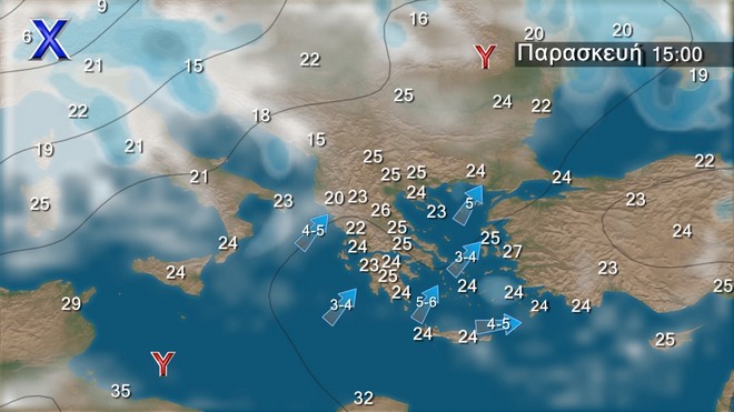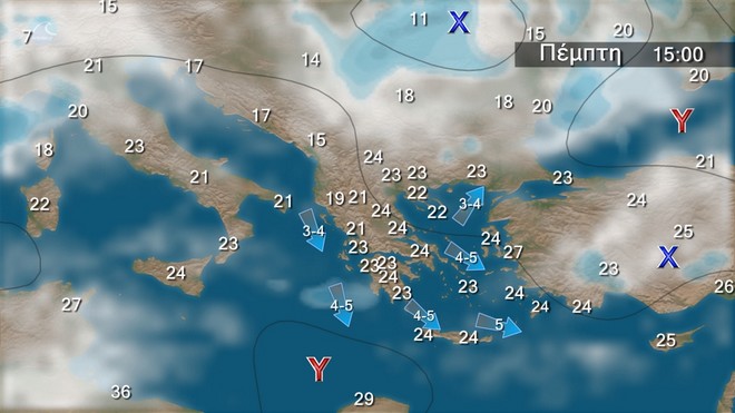Προβλέπεται γενικά βελτιωμένος καιρός. Τοπικές νεφώσεις στα δυτικά, τα βόρεια και τις πρωινές ώρες στο ανατολικό Αιγαίο. Οι άνεμοι θα πνέουν βορειοδυτικοί 4 με 6 μποφόρ και μόνο στα βορειοανατολικά βορειοανατολικοί 3 με 5 μπόφόρ. Σταδιακή εξασθένηση αναμένεται από το βράδυ. Η θερμοκρασία θα σημειώσει στα βόρεια μικρή πτώση.