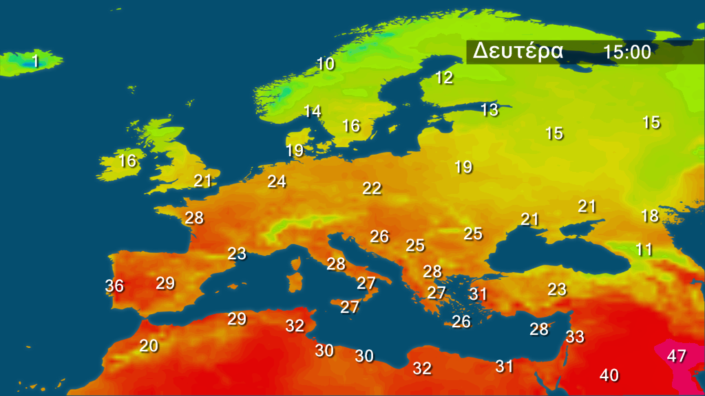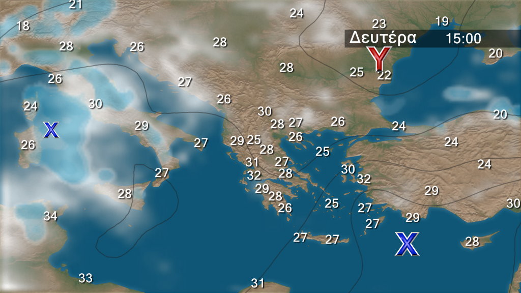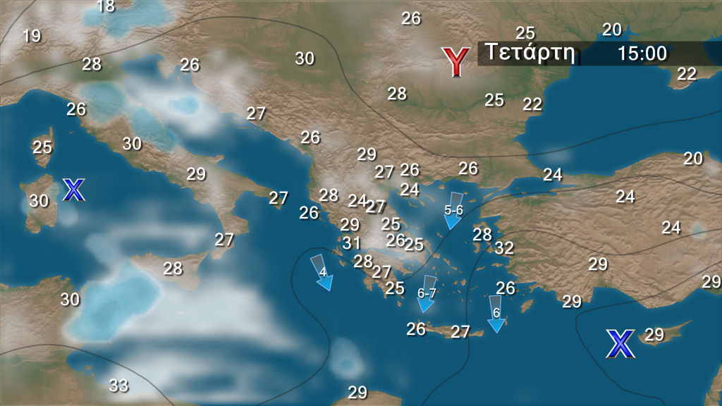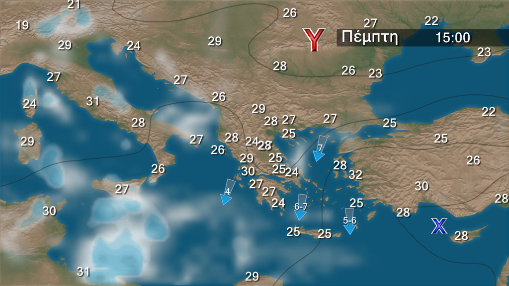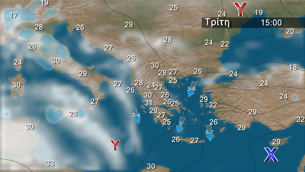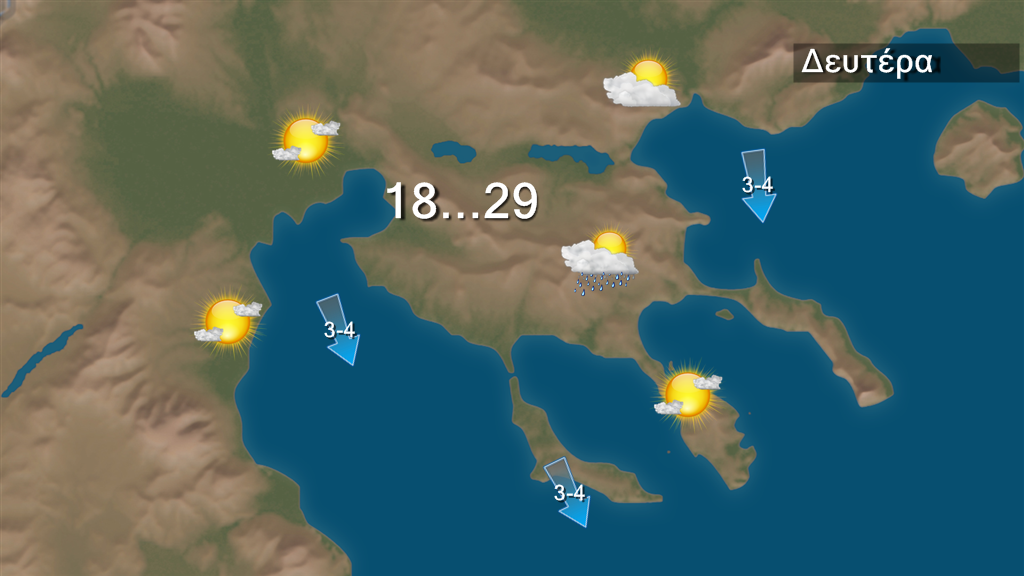 Σήμερα, στις περισσότερες περιοχές προβλέπονται λίγες νεφώσεις παροδικά αυξημένες στα ανατολικά και νότια με σποραδικές βροχές ή μπόρες. Οι άνεμοι θα πνέουν Βόρειοι και στο Αιγαίο θα φτάνουν τα 6 με 7 μποφόρ. Η θερμοκρασία θα φτάσει τους 28 με 31 βαθμούς Κελσίου.