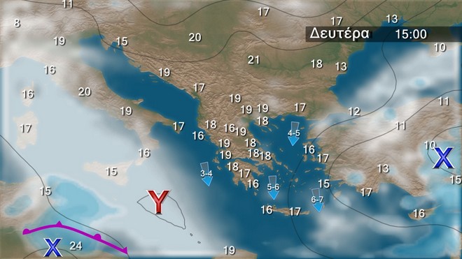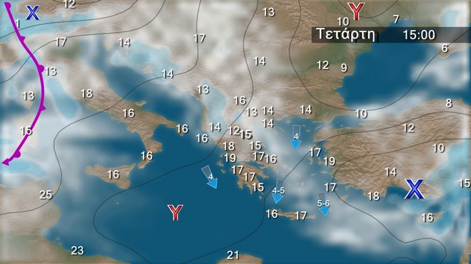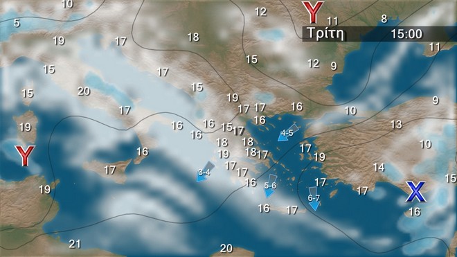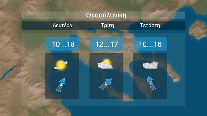 Το επόμενο τριήμερο προβλέπονται λίγες νεφώσεις παροδικά αυξημένες στα δυτικά και τα βόρεια, ενώ τις μεσημβρινές και απογευματινές ώρες στα ηπειρωτικά οι νεφώσεις θα αυξηθούν και είναι πιθανόν στα κεντρικά και βόρεια ορεινά να εκδηλωθούν πρόσκαιροι όμβροι. Οι άνεμοι θα πνέουν στα δυτικά βόρειοι βορειοδυτικοί 3 με 4 μποφόρ, στα ανατολικά από βόρειες διευθύνσεις 4 με 6 και στο Αιγαίο τοπικά 7 μποφόρ. Η θερμοκρασία θα παρουσιάσει άνοδο.
