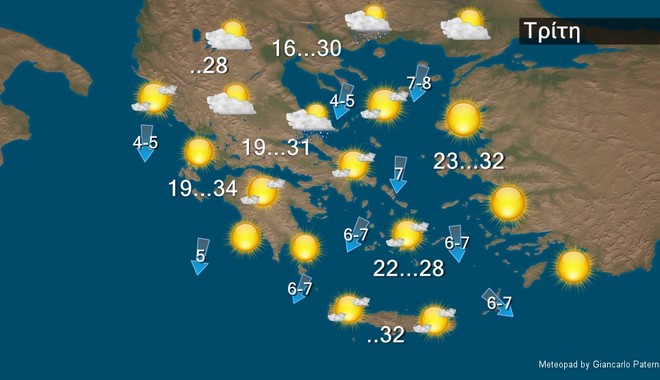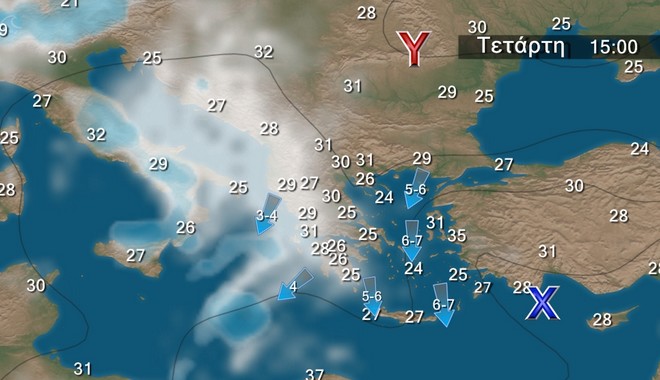 Νεφώσεις κατά διαστήματα αυξημένες, με τοπικές βροχές και σποραδικές καταιγίδες, κυρίως στα κεντρικά και βόρεια. Οι άνεμοι θα πνέουν δυτικοί βορειοδυτικοί 3 με 5 και στα πελάγη τοπικά 6 μποφόρ. Η θερμοκρασία δεν θα σημειώσει αξιόλογη μεταβολή.