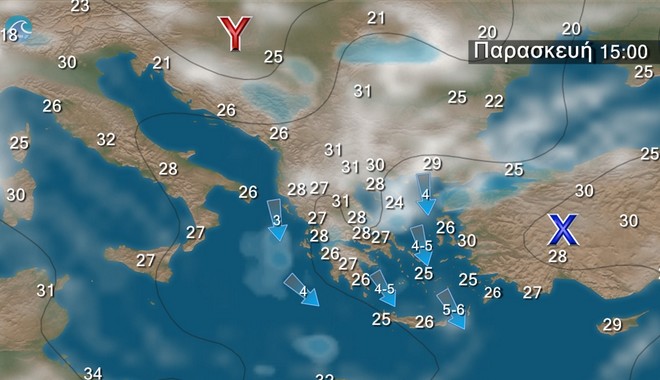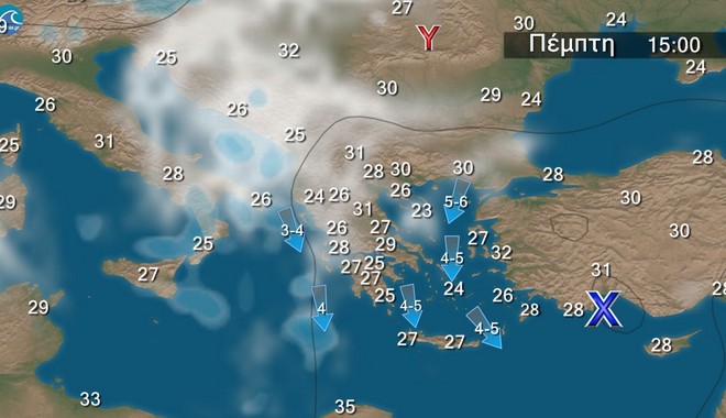 Γενικά αίθριος καιρός, με τοπικές νεφώσεις στα ανατολικά ηπειρωτικά, τις Σποράδες, την Εύβοια και τη βόρεια Κρήτη. Οι άνεμοι θα πνέουν βόρειοι βορειοανατολικοί, στα δυτικά 4 με 5, στα ανατολικά 5 με 7 και στο βόρειο Αιγαίο πιθανώς έως 8 μποφόρ. Η θερμοκρασία δεν θα σημειώσει αξιόλογη μεταβολή.