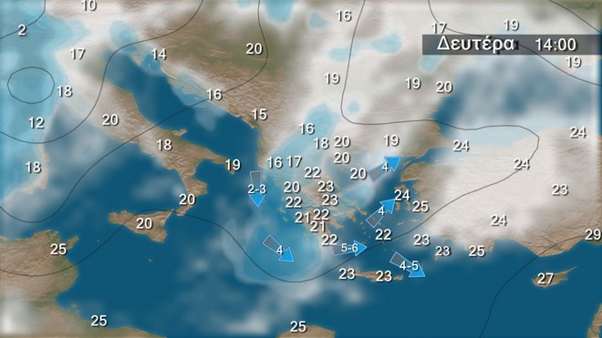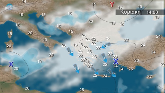 Στα δυτικά, κεντρικά και βόρεια προβλέπονται νεφώσεις που γρήγορα θα αυξηθούν και θα σημειωθούν τοπικές βροχές. Σποραδικές καταιγίδες θα εκδηλωθούν μετά το μεσημέρι κυρίως στα βορειοδυτικά. Στην υπόλοιπη χώρα προβλέπονται αραιές νεφώσεις. Το πρωί η ορατότητα θα είναι κατά τόπους περιορισμένη. Οι άνεμοι στα νότια θα πνέουν από δυτικές διευθύνσεις 4 με 5 και από το μεσημέρι τοπικά 6 μποφόρ. Στην υπόλοιπη χώρα θα πνέουν από νότιες διευθύνσεις 3 με 5 μποφόρ. Από το απόγευμα στα δυτικά θα στραφούν σε δυτικούς βορειοδυτικούς έως 4 μποφόρ. Η θερμοκρασία θα σημειώσει πτώση στα δυτικά και βόρεια.