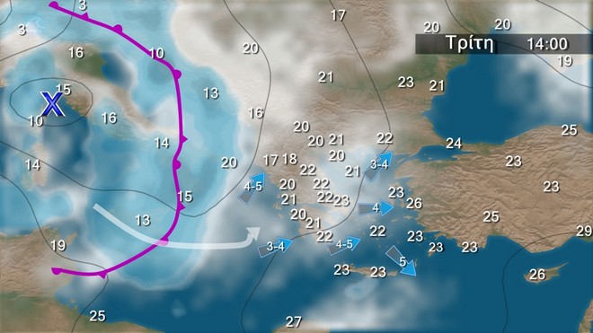 Στα δυτικά προβλέπονται λίγες νεφώσεις που γρήγορα θα αυξηθούν και θα σημειωθούν τοπικές βροχές και βαθμιαία σποραδικές καταιγίδες. Τη νύχτα τα φαινόμενα στο Ιόνιο θα ενταθούν. Στην υπόλοιπη χώρα αρχικά αίθριος καιρός, βαθμιαία θα αναπτυχθούν τοπικές νεφώσεις και στα βόρεια θα σημειωθούν τοπικές βροχές. Οι άνεμοι θα πνέουν αρχικά νοτιοδυτικοί 3 με 5 μποφόρ, στρεφόμενοι βαθμιαία σε νότιους νοτιοανατολικούς, στο Ιόνιο τοπικά 6 και τη νύχτα έως 7 μποφόρ. Η θερμοκρασία δεν θα σημειώσει αξιόλογη μεταβολή.