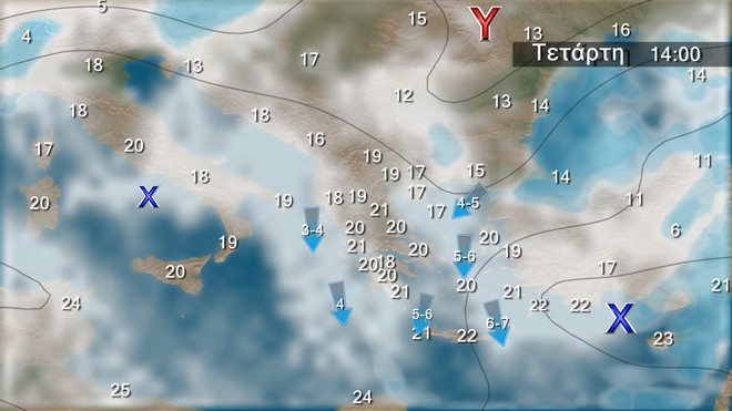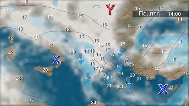 ανατολικά έως 5 και στο Αιγαίο τοπικά 6 μποφόρ. Από το απόγευμα στα νοτιοανατολικά θα ενισχυθούν και θα φτάσουν τα 7 μποφόρ. Η θερμοκρασία δεν θα σημειώσει αξιόλογη μεταβολή.