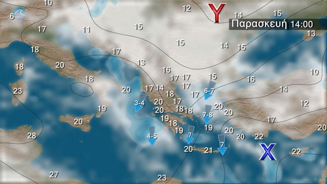 Νεφώσεις κατά διαστήματα αυξημένες, με τοπικές βροχές κυρίως στα ανατολικά ηπειρωτικά και τη βόρεια Κρήτη. Οι άνεμοι θα πνέουν βόρειοι βορειοανατολικοί στα δυτικά 3 με 5, στα ανατολικά 4 με 6 και στο Αιγαίο 7-8 μποφόρ. Η θερμοκρασία θα σημειώσει σταδιακή πτώση.
