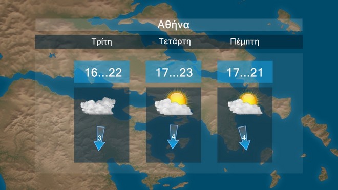 Στα ανατολικά λίγες νεφώσεις παροδικά αυξημένες, με ασθενείς τοπικές βροχές στα ηπειρωτικά και βαθμιαία στη βόρεια Κρήτη. Στην υπόλοιπη χώρα αραιές νεφώσεις κατά διαστήματα πιο πυκνές. Η ορατότητα τις πρωινές ώρες στα δυτικά θα είναι κατά τόπους περιορισμένη. Οι άνεμοι θα πνέουν από βόρειες διευθύνσεις, στα δυτικά 3 με 4, στα