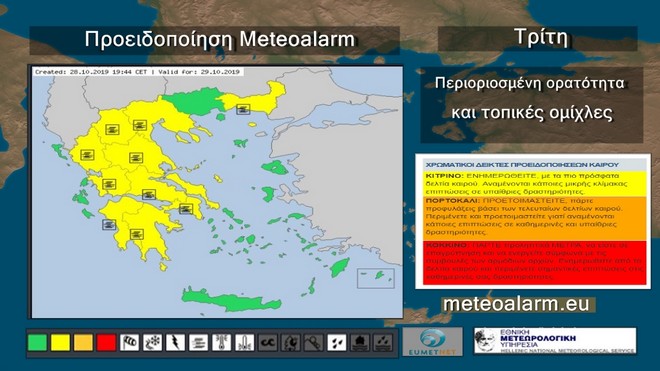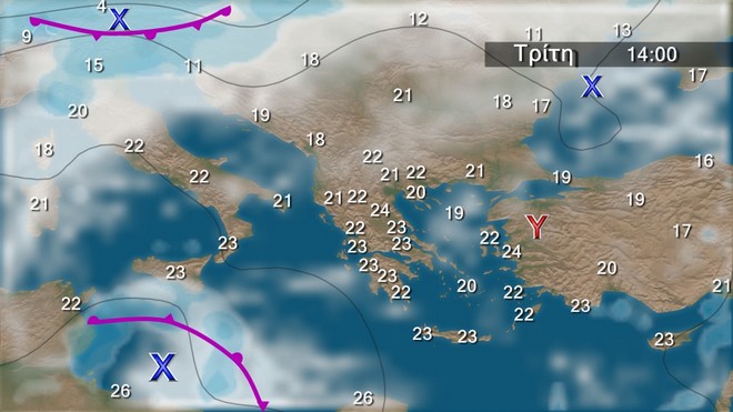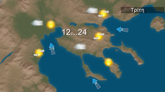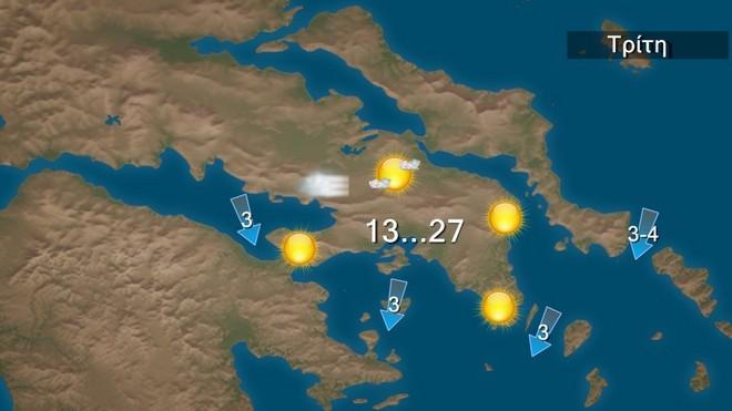 Την Τρίτη προβλέπεται γενικά αίθριος καιρός αλλά αργότερα στα νοτιοδυτικά θα αναπτυχθούν τοπικές νεφώσεις με πιθανότητα σποραδικών βροχών στο Ιόνιο τη νύχτα. Κατά τόπους περιορισμένη ορατότητα ή ομίχλες τις πρωινές και βραδινές ώρες, κυρίως στα ηπειρωτικά. Η θερμοκρασία θα διατηρηθεί σε υψηλά επίπεδα ως προς τις μέγιστες τιμές της στα ηπειρωτικά και θα φτάσει τους 25 βαθμούς στα βόρεια, στα υπόλοιπα ηπειρωτικά και το Ιόνιο τους 27 και στα νησιά του Αιγαίου τους 23 με 26 βαθμούς Κελσίου.
