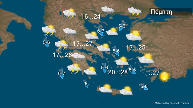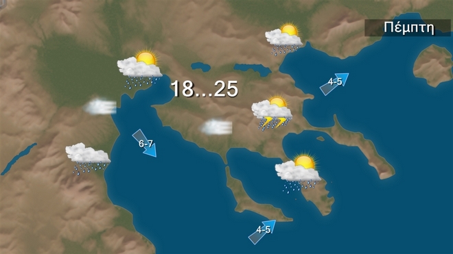 Την Πέμπτη 8/10 στην Κρήτη και τα Δωδεκάνησα προβλέπονται λίγες νεφώσεις παροδικά αυξημένες με πιθανότητα πρόσκαιρων βροχών μετά το μεσημέρι. Στις υπόλοιπες περιοχές προβλέπονται αυξημένες νεφώσεις με τοπικές βροχές, ενώ καταιγίδες θα εκδηλωθούν κυρίως στα δυτικά, τα κεντρικά, τα βόρεια και βαθμιαία στα νησιά του ανατολικού Αιγαίου. Από αργά το απόγευμα τα φαινόμενα στα δυτικά θα σταματήσουν και μέχρι τη νύχτα θα περιοριστούν στην ανατολική Μακεδονία, τη Θράκη και τα νησιά του ανατολικού Αιγαίου.