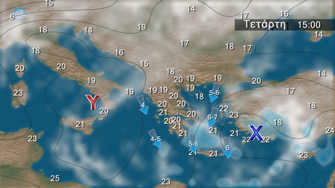 Στην ανατολική Στερεά, την Εύβοια, τις Κυκλάδες την Κρήτη, και τα Δωδεκάνησα αυξημένες νεφώσεις με τοπικές βροχές και πιθανόν στην Κρήτη μεμονωμένες καταιγίδες. Το βράδυ οι βροχές θα περιοριστούν στα νότια. Στην υπόλοιπη χώρα γενικά αίθριος καιρός. Οι άνεμοι θα πνέουν βόρειοι βορειοανατολικοί, στα δυτικά 3 με 5, στα ανατολικά 4 με 6 και στο Αιγαίο τοπικά 7 μποφόρ με μικρή εξασθένηση το βράδυ. Η θερμοκρασία θα σημειώσει μικρή άνοδο.