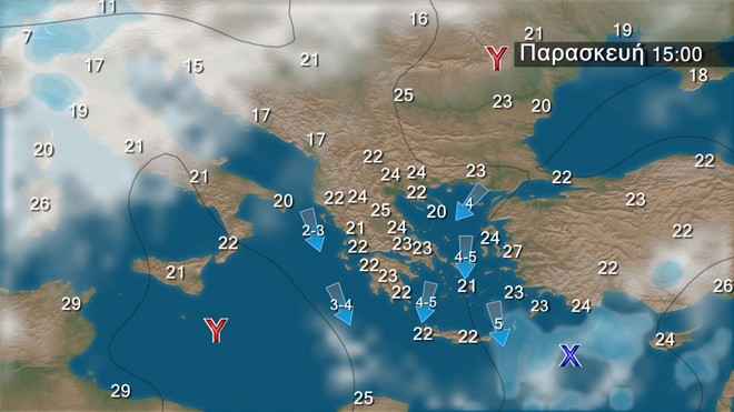 Γενικά αίθριος καιρός, με παροδικές νεφώσεις στο νότιο Αιγαίο όπου θα σημειωθούν τοπικές βροχές κυρίως στην Κρήτη. Οι άνεμοι θα πνέουν από βόρειες διευθύνσεις 3 με 5 μποφόρ. Η θερμοκρασία δεν θα σημειώσει αξιόλογη μεταβολή.